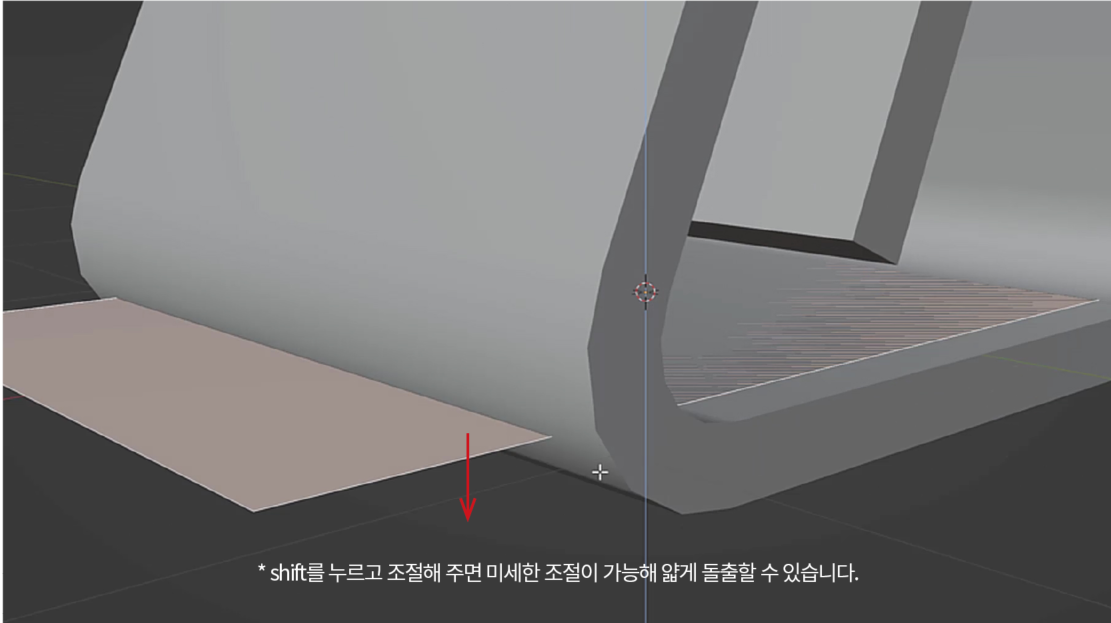 Tab, 에디트 모드에서 엣지 선택 모드로 평면의 앞쪽 엣지를 선택하여 E, Z로 앞면을 짧게 만들어 줍니다.
