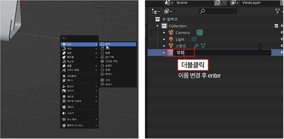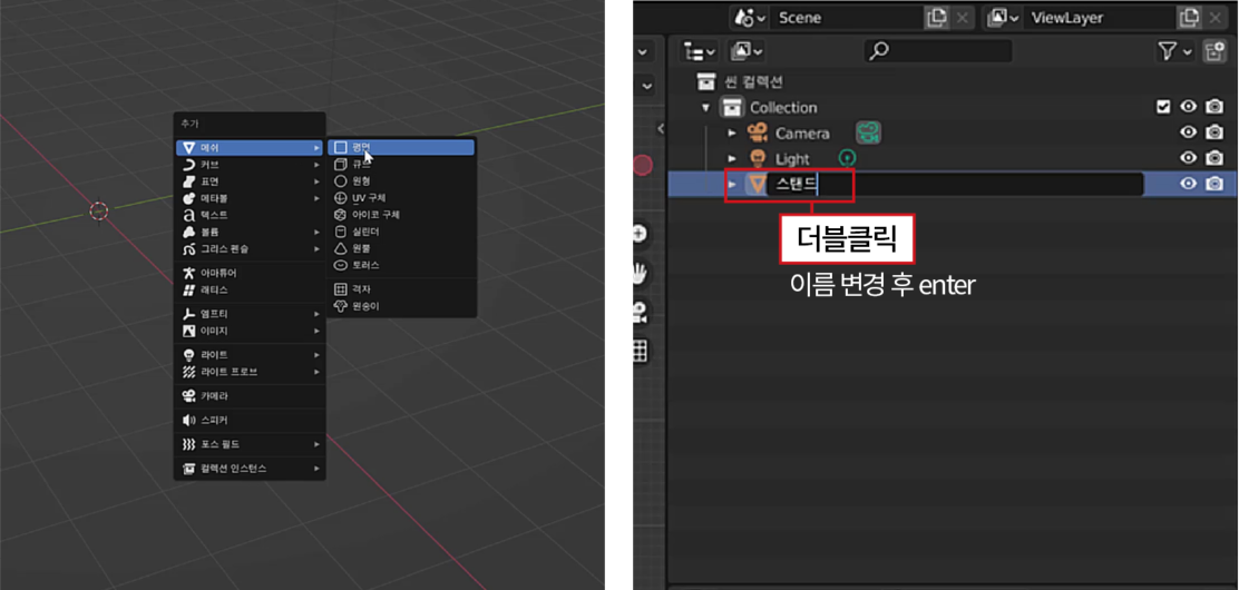 shift+A로 새로운 평면을 생성하고, 오브젝트의 이름을 스탠드로 변경합니다.
