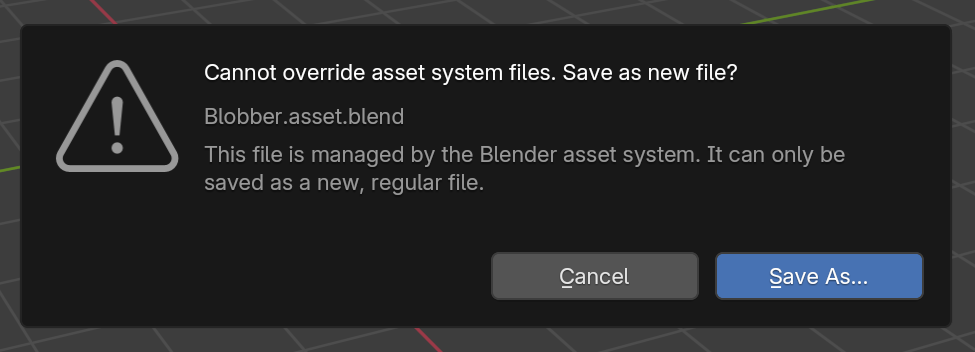 이 파일은 Blender의 자산 시스템에 의해 생성 및 관리되며, 단일 데이터 블록(모든 종속성이 포함된)을 포함하며, Blender 내에서 이 파일을 덮어쓸 수 없습니다.파일을 열고 새 파일로 저장할 수는 있지만, 이 경우 일반 블렌드 파일로 저장할 수 있습니다.