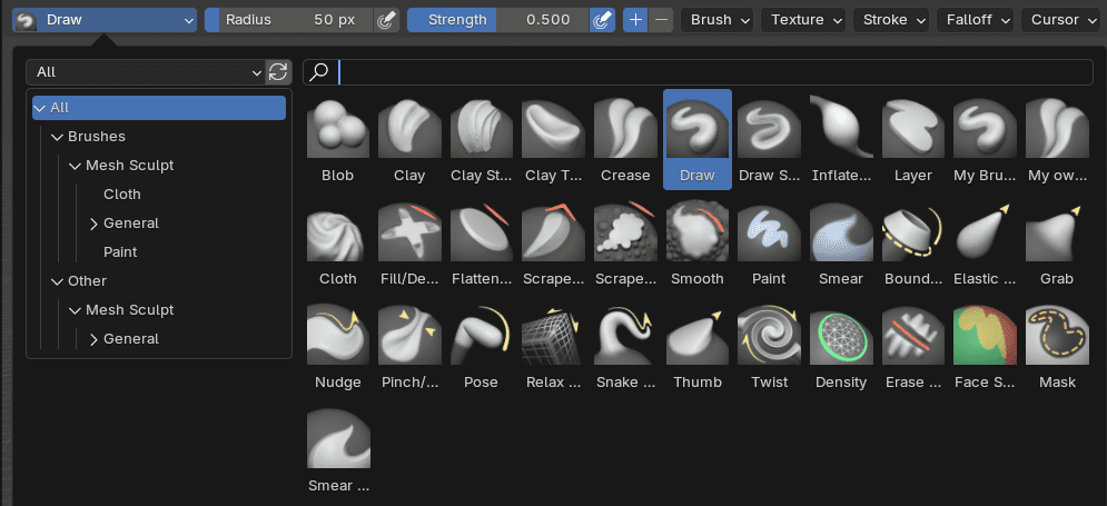 앞서 언급했듯이 블렌더에는 브러시의 출발점으로 사용할 수 있는 모든 브러시 유형을 포괄하는 필수 브러시 세트가 포함되어 있지만, 새로운 브러시 세트를 만들 수도 있습니다.