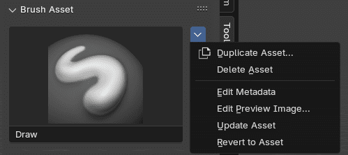 설정을 미세 조정한 후 Update Asset으로 변경 사항을 저장하고 Edit Metadata 또는 Preview Image로 브러시의 다른 데이터를 수정할 수 있습니다.이 방법으로 편집할 수 있는 것은 Duplicate Asset 방식으로 생성된 브러시 세트만 가능합니다.나머지는 일반 local brush data-block으로 관리됩니다.
